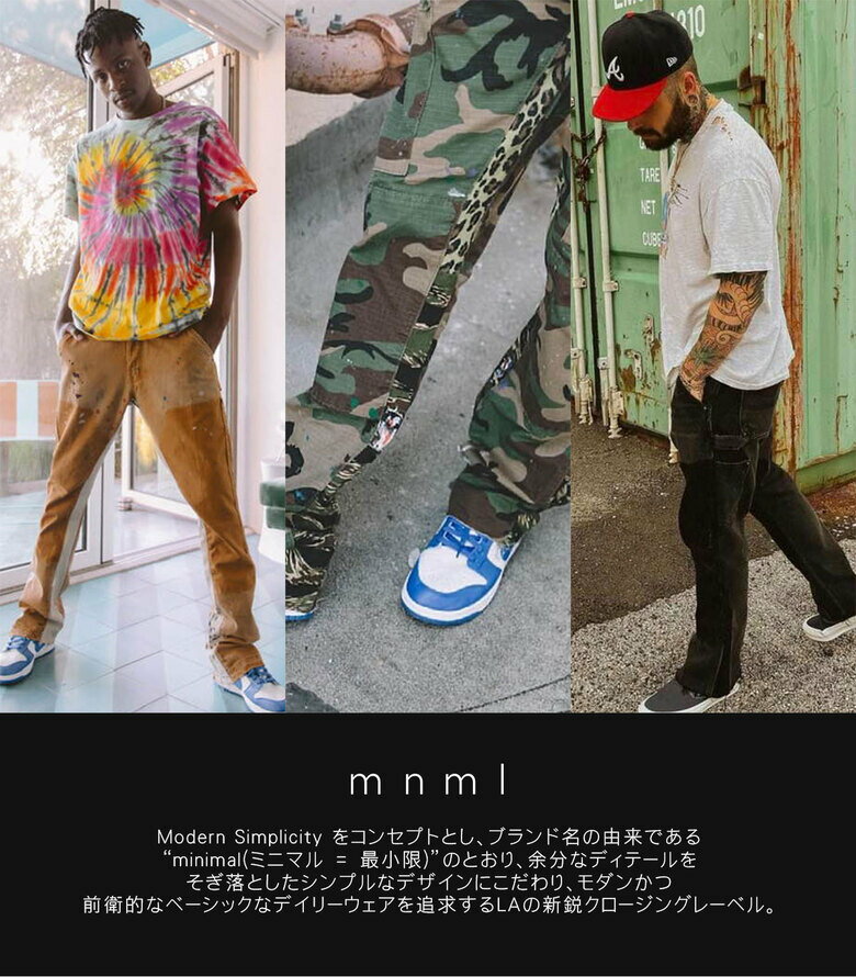 【mnml/ミニマル】 Modern Simplicity をコンセプトとし、ブランド名の由来である“minimal(ミニマル = 最小限)”のとおり、 余分なディテールをそぎ落としたシンプルなデザインにこだわり、 モダンかつ前衛的なベーシックなデイリーウェアを追求するLAの新鋭クロージングレーベル。